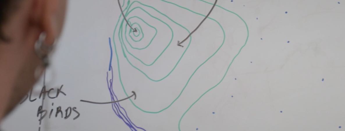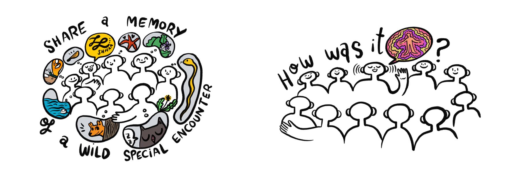 La segunda fase consiste en formar equipos (de gente que todavía no se conoce) para dibujar juntas una parte del paisaje sonoro. La actividad consiste en acordar y dibujar sobre papel la posición de los diferentes elementos naturales (montaña, lluvia, río, mar, pradera, humedal, etc.) para formar una cartografía coherente.